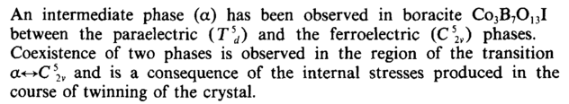 An intermediate phase (a) has been observed in boracite Co3B7013I between the paraelectric (T5d) and the ferroelectric (С52„) phases. Coexistence of two phases is observed in the region of the transition a«-*-C52v and is a consequence of the internal stresses produced in the course of twinning of the crystal.