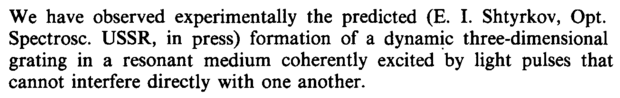 We have observed experimentally the predicted (Ε. I. Shtyrkov, Opt. Spectrosc. USSR, in press) formation of a dynamic three-dimensional grating in a resonant medium coherently excited by light pulses that cannot interfere directly with one another.