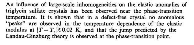 An influence of large-scale inhomogeneities on the elastic anomalies of triglycin sulfate crystals has been observed near the phase-transition temperature. It is shown that in a defect-free crystal no anomalous "peaks" are observed in the temperature dependence of the elastic modulus at (Г—Гс|£0.02 К, and that the jump predicted by the Landau-Ginzburg theory is observed at the phase-transition point.