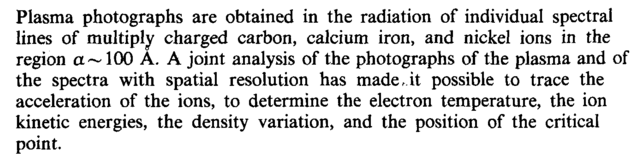 Plasma photographs are obtained in the radiation of individual spectral lines of multiply charged carbon, calcium iron, and nickel ions in the region a~ 100 A. A joint analysis of the photographs of the plasma and of the spectra with spatial resolution has made.it possible to trace the acceleration of the ions, to determine the electron temperature, the ion kinetic energies, the density variation, and the position of the critical point.