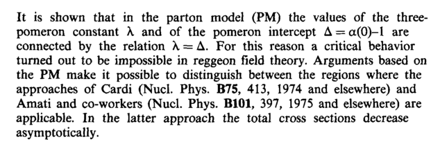 It is shown that in the partem model (PM) the values of the three-pomeron constant λ and of the pomeron intercept Δ = α(0)-1 are connected by the relation λ = Δ. For this reason a critical behavior turned out to be impossible in reggeon field theory. Arguments based on the PM make it possible to distinguish between the regions where the approaches of Cardi (Nucl. Phys. B75, 413, 1974 and elsewhere) and Amati and co-workers (Nucl. Phys. B101, 397, 1975 and elsewhere) are applicable. In the latter approach the total cross sections decrease asymptotically.