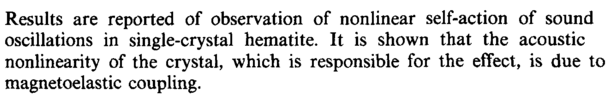 Results are reported of observation of nonlinear self-action of sound oscillations in single-crystal hematite. It is shown that the acoustic nonlinearity of the crystal, which is responsible for the effect, is due to magnetoelastic coupling.