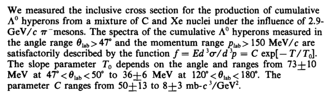 We measured the inclusive cross section for the production of cumulative Λ0 hyperons from a mixture of ó and Xe nuclei under the influence of 2.9-GeV/c π "mesons. The spectra of the cumulative ì0 hyperons measured in the angle range 0]ab>47° and the momentum range plab> 150 MeV/c are satisfactorily described by the function / = Edzar/d3p = ó exp[— ç/ç0]. The slope parameter ç0 depends on the angle and ranges from 73+10 MeV at 47°<0lab<5O° to 36+6 MeV at 120Ï<×,ÁØ< 180°. The parameter ó ranges from 50+13 to 8+3 mb-c3/GeV2.