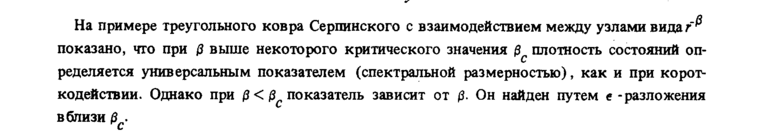 На примере треугольного ковра Серпинского с взаимодействием между узлами вида fр показано, что при β выше некоторого критического значения ^ плотность состояний определяется универсальным показателем (спектральной размерностью), как и при корот-кодействии. Однако при β< β£ показатель зависит от β. Он найден путем е -разложения вблизи β .