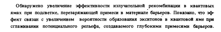Обнаружено увеличение эффектовности излучательной рекомбинации в квантовых ямах при подсветке, перезаряжающей примеси в материале барьеров. Показано, что эффект связан с увеличением вероятности образования экситонов в квантовой яме при сглаживании потенциального рельефа, создаваемого глубокими примесями барьеров.