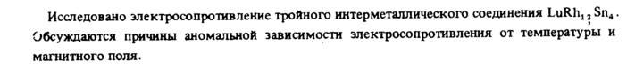Исследовано электросопротивление тройного интерметаллического соединения LuRhj 2 Sn4. Обсуждаются причины аномальной зависимости электросопротивления от температуры и магнитного поля.
