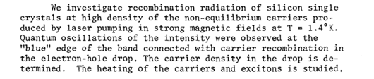 We investigate recombination radiation of silicon single crystals at high density of the non-equilibrium carriers produced by laser pumping in strong magnetic fields at Τ = 1.4°K. Quantum oscillations of the intensity were observed at the "blue" edge of the band connected with carrier recombination in the electron-hole drop. The carrier density in the drop is determined. The heating of the carriers and excitons is studied.