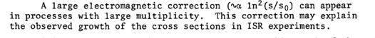 A large electromagnetic correction (vx lnz(s/so) can appear in processes with large multiplicity. This correction may explain the observed growth of the cross sections in ISR experiments.