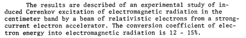The results are described of an experimental study of induced Cerenkov excitation of electromagnetic radiation in the centimeter band by a beam of relativistic electrons from a strong-current electron accelerator. The conversion coefficient of electron energy into electromagnetic radiation is 12 15%.