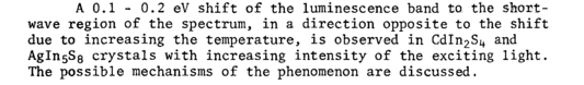 A 0.1 0.2 eV shift of the luminescence band to the shortwave region of the spectrum, in a direction opposite to the shift due to increasing the temperature, is observed in CdIn2Si+ and AglnsSs crystals with increasing intensity of the exciting light. The possible mechanisms of the phenomenon are discussed.