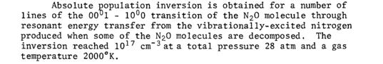 Absolute population inversion is obtained for a number of lines of the 00^1 10°0 transition of the N20 molecule through resonant energy transfer from the vibrationally-excited nitrogen produced when some of the N2O molecules are decomposed, The inversion reached 1017 cm"3 at a total pressure 28 atm and a gas temperature 2000°K.