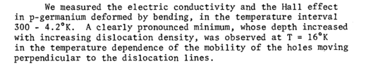 We measured the electric conductivity and the Hall effect in p-germanium deformed by bending, in the temperature interval 300 4.2°K. A clearly pronounced minimum, whose depth increased with increasing dislocation density, was observed at Τ = 16°K in the temperature dependence of the mobility of the holes moving perpendicular to the dislocation lines.