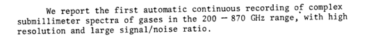 We report the first automatic continuous recording of complex submillimeter spectra of gases in the 200 870 GHz range, with high resolution and large signal/noise ratio.