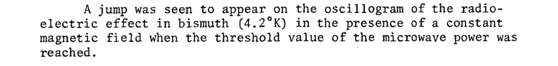 A jump was seen to appear on the oscillogram of the radio-electric effect in bismuth (4.2°K) in the presence of a constant magnetic field when the threshold value of the microwave power was reached.