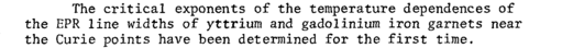 The critical exponents of the temperature dependences of the EPR line widths of yttrium and gadolinium iron garnets near the Curie points have been determined for the first time.