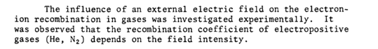 The influence of an external electric field on the electron-ion recombination in gases was investigated experimentally. It was observed that the recombination coefficient of electropositive gases (He, N2) depends on the field intensity.