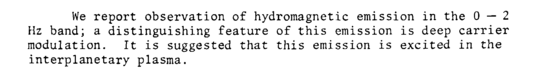 We report observation of hydromagnetic emission in the 0—2 Hz band; a distinguishing feature of this emission is deep carrier modulation. It is suggested that this emission is excited in the interplanetary plasma.
