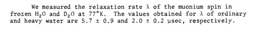 We measured the relaxation rate λ of the muonium spin in frozen H20 and D20 at 77°K. The values obtained for λ of ordinary and heavy water are 5.7 ± 0.9 and 2.0 ± 0.2 usee, respectively.