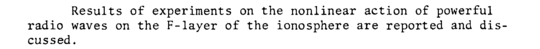 Results of experiments on the nonlinear action of powerful radio waves on the F-layer of the ionosphere are reported and discussed.