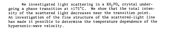 We investigated light scattering in a KH2P04 crystal undergoing a phase transition at ±175°C. We show that the total intensity of the scattered light decreases near the transition point. An investigation of the fine structure of the scattered-light line has made it possible to determine the temperature dependence of the hypersonic-wave velocity.