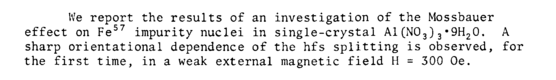 We report the results of an investigation of the Mossbauer effect on Fe57 impurity nuclei in single-crystal ΑΙ (N03)3·9Η20. A sharp orientational dependence of the hfs splitting is observed, for the first time, in a weak external magnetic field Η = 300 Oe.