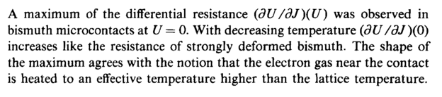 A maximum of the differential resistance (dU/dJ)(U) was observed in bismuth microcontacts at U = 0. With decreasing temperature (dU/dJ)(0) increases like the resistance of strongly deformed bismuth. The shape of the maximum agrees with the notion that the electron gas near the contact is heated to an effective temperature higher than the lattice temperature.