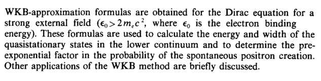 WKB-approximation formulas are obtained for the Dirac equation for a strong external field (e0>2mec2, where e0 is the electron binding energy). These formulas are used to calculate the energy and width of the quasistationary states in the lower continuum and to determine the pre-exponential factor in the probability of the spontaneous positron creation. Other applications of the WKB method are briefly discussed.