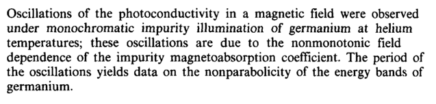 Oscillations of the photoconductivity in a magnetic field were observed under monochromatic impurity illumination of germanium at helium temperatures; these oscillations are due to the nonmonotonic field dependence of the impurity magnetoabsorption coefficient. The period of the oscillations yields data on the nonparabolicity of the energy bands of germanium.