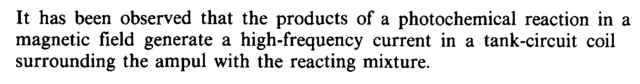 It has been observed that the products of a photochemical reaction in a magnetic field generate a high-frequency current in a tank-circuit coil surrounding the ampul with the reacting mixture.