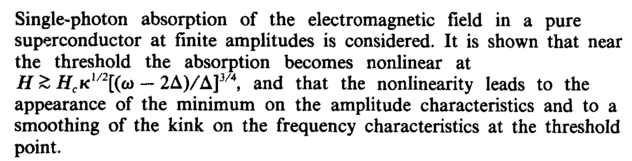 Single-photon absorption of the electromagnetic field in a pure superconductor at finite amplitudes is considered. It is shown that near the threshold the absorption becomes nonlinear at ñ£ñÓË1/2[(Ê>-2ä)/ä]3/4, and that the nonlinearity leads to the appearance of the minimum on the amplitude characteristics and to a smoothing of the kink on the frequency characteristics at the threshold point.