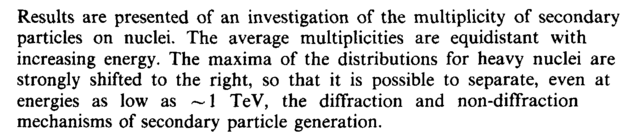 Results are presented of an investigation of the multiplicity of secondary particles on nuclei. The average multiplicities are equidistant with increasing energy. The maxima of the distributions for heavy nuclei are strongly shifted to the right, so that it is possible to separate, even at energies as low as ~ 1 TeV, the diffraction and non-diffraction mechanisms of secondary particle generation.