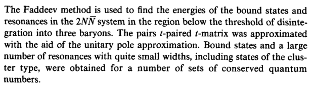The Faddeev method is used to find the energies of the bound states and resonances in the INN system in the region below the threshold of disintegration into three baryons. The pairs /-paired Mnatrix was approximated with the aid of the unitary pole approximation. Bound states and a large number of resonances with quite small widths, including states of the cluster type, were obtained for a number of sets of conserved quantum numbers.