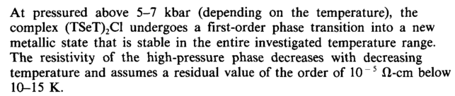 At pressured above 5-7 kbar (depending on the temperature), the complex (TSeT)2Cl undergoes a first-order phase transition into a new metallic state that is stable in the entire investigated temperature range. The resistivity of the high-pressure phase decreases with decreasing temperature and assumes a residual value of the order of 10 ~5 Ω-cm below 10-15 K.