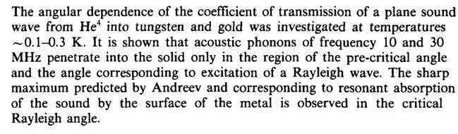 The angular dependence of the coefficient of transmission of a plane sound wave from He4 into tungsten and gold was investigated at temperatures — 0.1-0.3 K. It is shown that acoustic phonons of frequency 10 and 30 MHz penetrate into the solid only in the region of the pre-critical angle and the angle corresponding to excitation of a Rayleigh wave. The sharp maximum predicted by Andreev and corresponding to resonant absorption of the sound by the surface of the metal is observed in the critical Rayleigh angle.