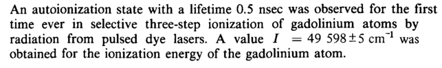 An autoionization state with a lifetime 0.5 nsec was observed for the first time ever in selective three-step ionization of gadolinium atoms by radiation from pulsed dye lasers. A value / = 49 598 ±5 cm'1 was obtained for the ionization energy of the gadolinium atom.