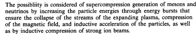 The possibility is considered of supercompression generation of mesons and neutrinos by increasing the particle energies through energy bursts that ensure the collapse of the streams of the expanding plasma, compression of the magnetic field, and inductive acceleration of the particles, as well as by inductive compression of strong ion beams.
