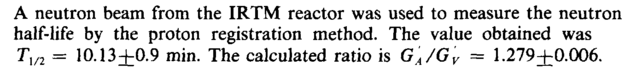 A neutron beam from the IRTM reactor was used to measure the neutron half-life by the proton registration method. The value obtained was Tm = 10.13+0.9 min. The calculated ratio is GA/GV = 1.279+0.006.