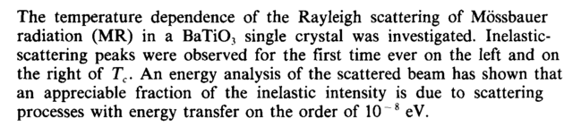 The temperature dependence of the Rayleigh scattering of Mossbauer radiation (MR) in a BaTi03 single crystal was investigated. Inelastic-scattering peaks were observed for the first time ever on the left and on the right of Tc. An energy analysis of the scattered beam has shown that an appreciable fraction of the inelastic intensity is due to scattering processes with energy transfer on the order of 10 ~8 eV.