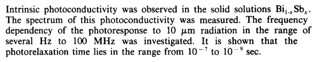 Intrinsic photoconductivity was observed in the solid solutions Bii.xSbx. The spectrum of this photoconductivity was measured. The frequency dependency of the photoresponse to 10 μπι radiation in the range of several Hz to 100 MHz was investigated. It is shown that the photorelaxation time lies in the range from 10"7 to 10 ~9 sec.