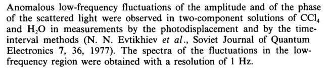 Anomalous low-frequency fluctuations of the amplitude and of the phase of the scattered light were observed in two-component solutions of CC14 and H20 in measurements by the photodisplacement and by the time-interval methods (N. N. Evtikhiev et a/., Soviet Journal of Quantum Electronics 7, 36, 1977). The spectra of the fluctuations in the low-frequency region were obtained with a resolution of 1 Hz.