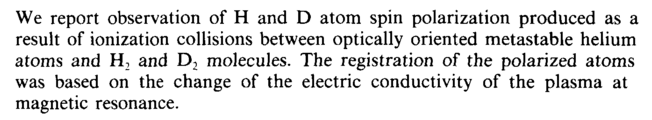 We report observation of Η and D atom spin polarization produced as a result of ionization collisions between optically oriented metastable helium atoms and H2 and D2 molecules. The registration of the polarized atoms was based on the change of the electric conductivity of the plasma at magnetic resonance.
