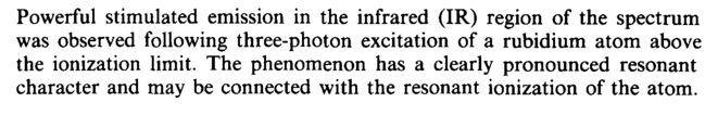 Powerful stimulated emission in the infrared (IR) region of the spectrum was observed following three-photon excitation of a rubidium atom above the ionization limit. The phenomenon has a clearly pronounced resonant character and may be connected with the resonant ionization of the atom.