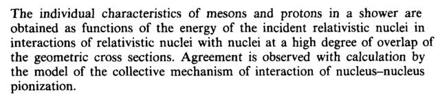 The individual characteristics of mesons and protons in a shower are obtained as functions of the energy of the incident relativistic nuclei in interactions of relativistic nuclei with nuclei at a high degree of overlap of the geometric cross sections. Agreement is observed with calculation by the model of the collective mechanism of interaction of nucleus-nucleus pionization.