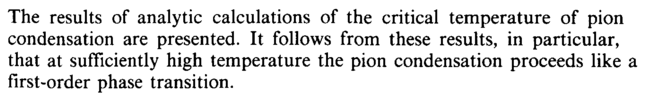 The results of analytic calculations of the critical temperature of pion condensation are presented. It follows from these results, in particular, that at sufficiently high temperature the pion condensation proceeds like a first-order phase transition.