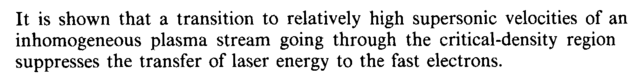 It is shown that a transition to relatively high supersonic velocities of an inhomogeneous plasma stream going through the critical-density region suppresses the transfer of laser energy to the fast electrons.