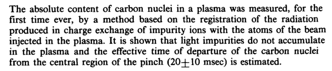 The absolute content of carbon nuclei in a plasma was measured, for the first time ever, by a method based on the registration of the radiation produced in charge exchange of impurity ions with the atoms of the beam injected in the plasma. It is shown that light impurities do not accumulate in the plasma and the effective time of departure of the carbon nuclei from the central region of the pinch (20^10 msec) is estimated.
