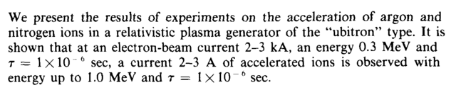 We present the results of experiments on the acceleration of argon and nitrogen ions in a relativistic plasma generator of the "ubitron" type. It is shown that at an electron-beam current 2-3 к A, an energy 0.3 MeV and τ = 1x10 6 sec, a current 2-3 A of accelerated ions is observed with energy up to 1.0 MeV and r = 1 X 10 ~6 sec.