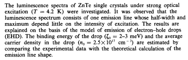 The luminescence spectra of ZnTe single crystals under strong optical excitation (Γ = 4.2 K) were investigated. It was observed that the luminescence spectrum consists of one emission line whose half-width and maximum depend little on the intensity of excitation. The results are explained on the basis of the model of emission of electron-hole drops (EHD). The binding energy of the drop (ζ0 = 2-3 meV) and the average carrier density in the drop (n0 = 2.5 XlO17 cm"3) are estimated by comparing the experimental data with the theoretical calculation of the emission line shape.