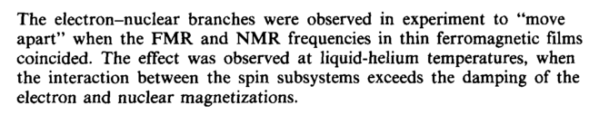 The electron-nuclear branches were observed in experiment to "move apart" when the FMR and NMR frequencies in thin ferromagnetic films coincided. The effect was observed at liquid-helium temperatures, when the interaction between the spin subsystems exceeds the damping of the electron and nuclear magnetizations.