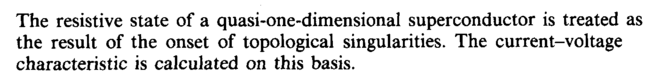 The resistive state of a quasi-one-dimensional superconductor is treated as the result of the onset of topological singularities. The current-voltage characteristic is calculated on this basis.
